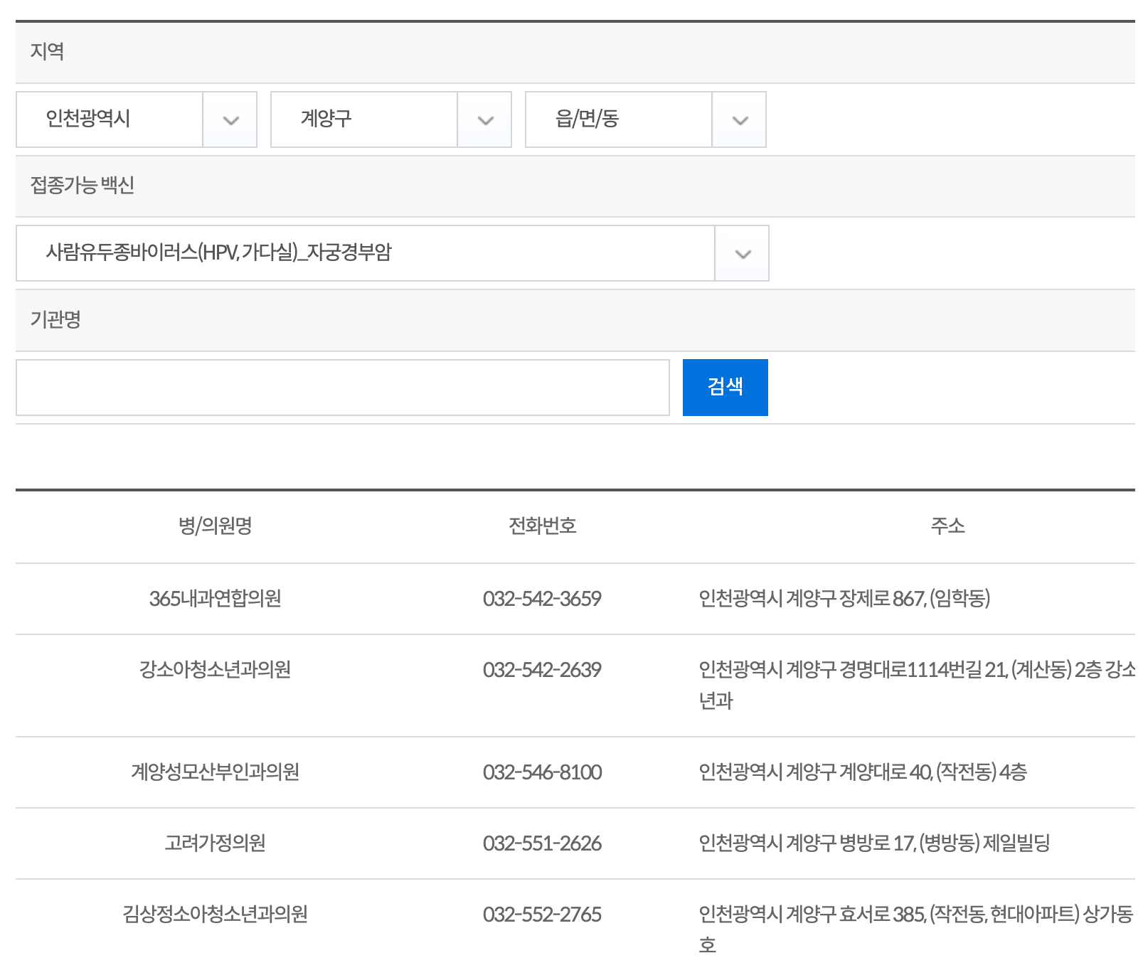 질병관리청의 예방접종도우미 누리집에서 국가예방접종 지정의료기관 찾기 서비스를 활용해 찾으실 수 있습니다. 본인이 거주 중인 시/도나 시/군/구를 입력한 뒤, 접종받고자 하는 백신의 종류를 입력하면 해당 백신을 접종하는 의료기관의 목록과 전화번호, 주소를 받으실 수 있습니다.
