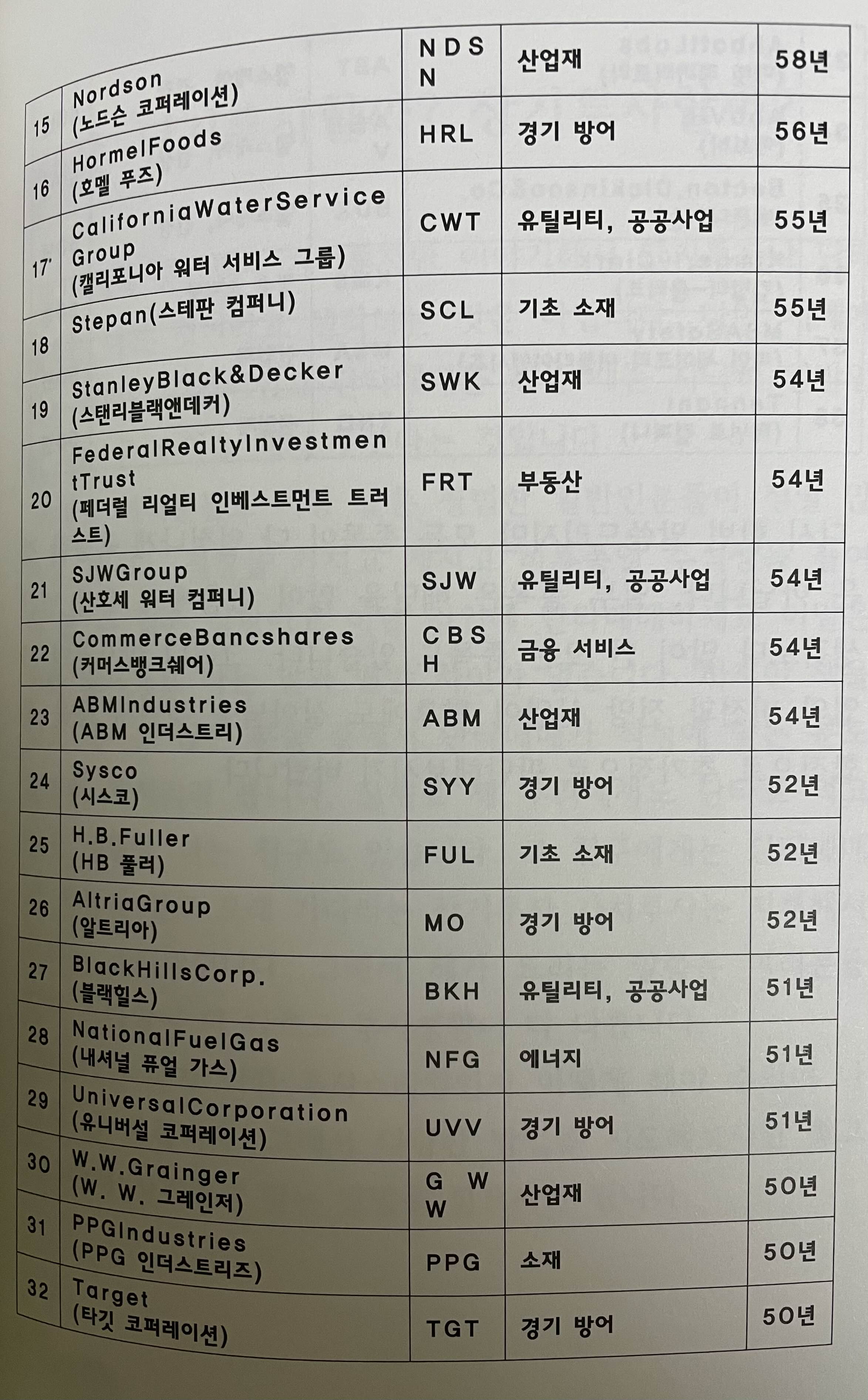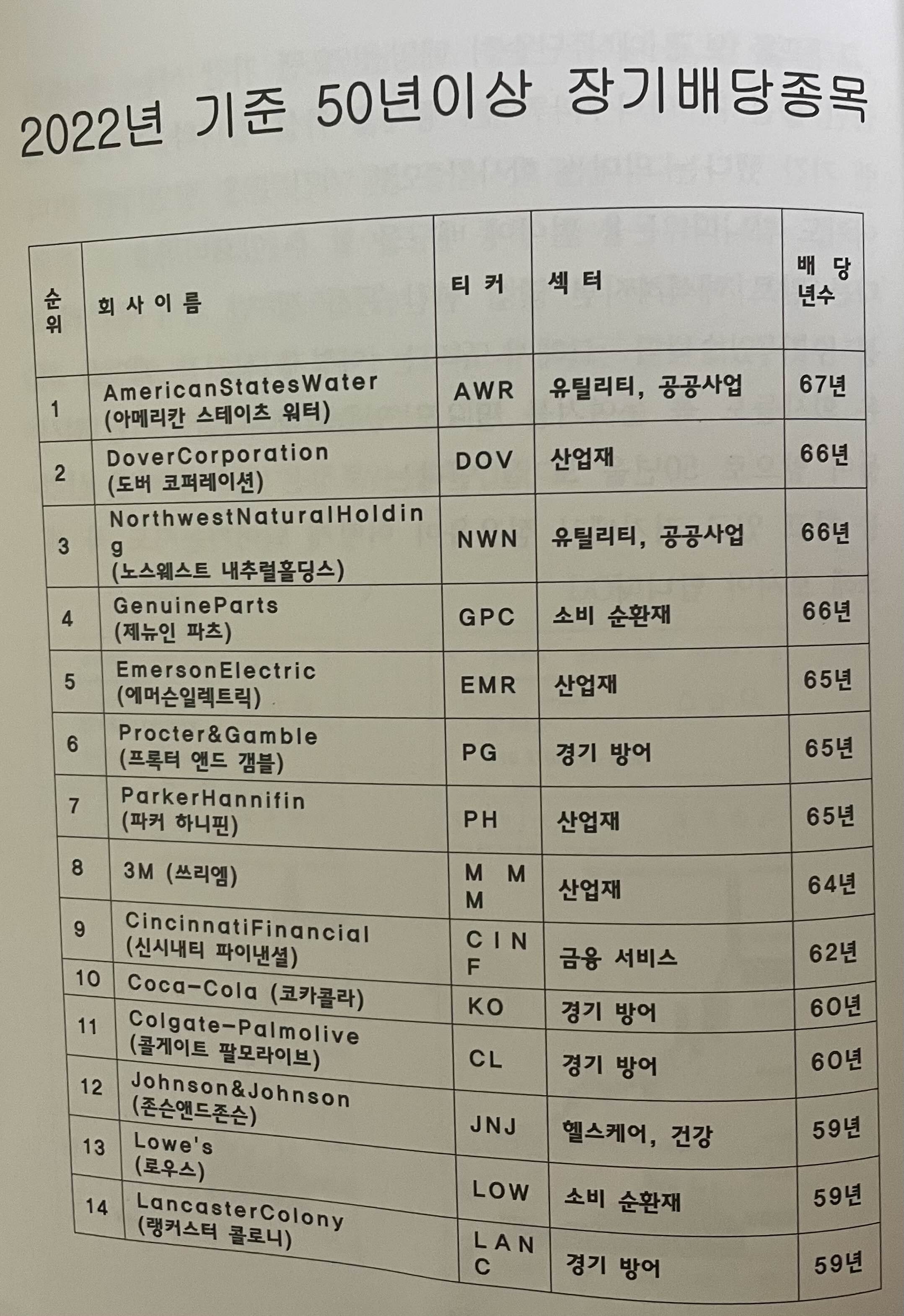 배당을 오래 했다는 의미는 회사가 오랜 기간 동안 돈을 잘 벌었다는 뜻이다. 다만 이런 회사들이 모두 다 엄청나게 폭등한 것은 아니고, 또 앞으로 50년을 또 잘 번다는 보장은 없으니 어떤 산업을 하고 있고 거기서 점유율이 어떻게 되어가는지, 전망 산업이 향후에 더 살아남을 것인지 등을 꼭 체크해보기