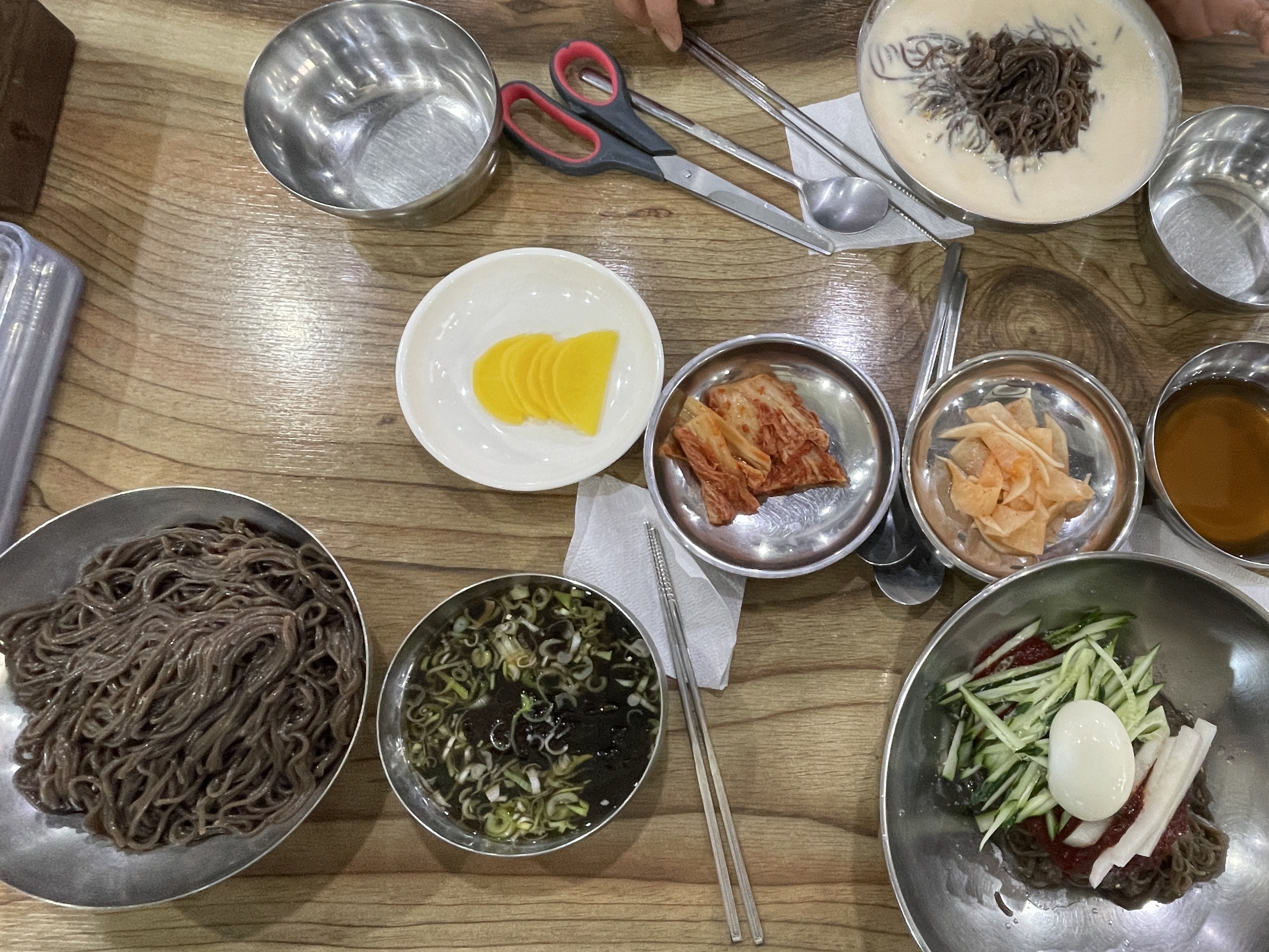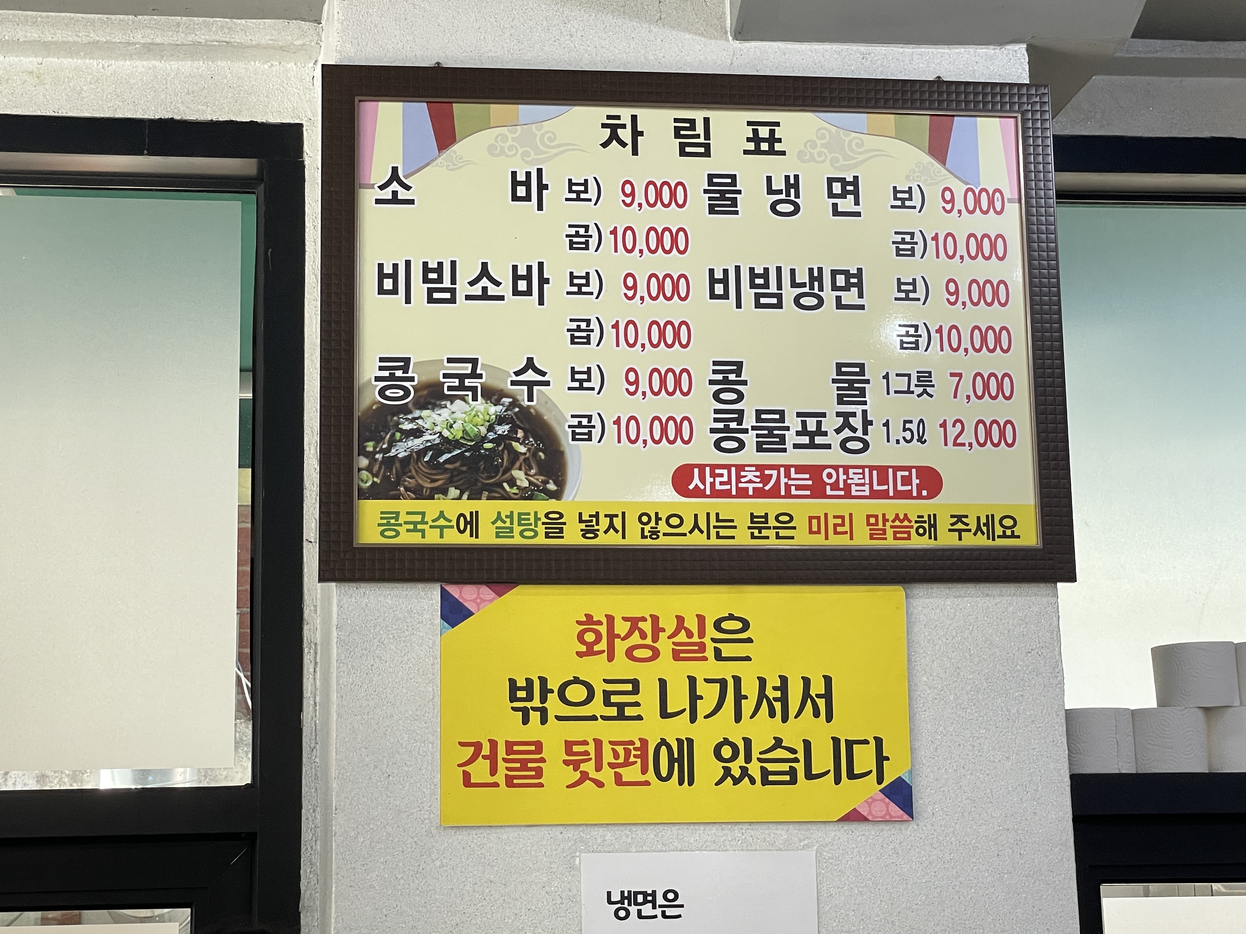 친구 두명이랑 같이 갔는데 콩국수, 소바, 비빔냉면하나씩 주문해서 조금씩 나눠먹었어요.