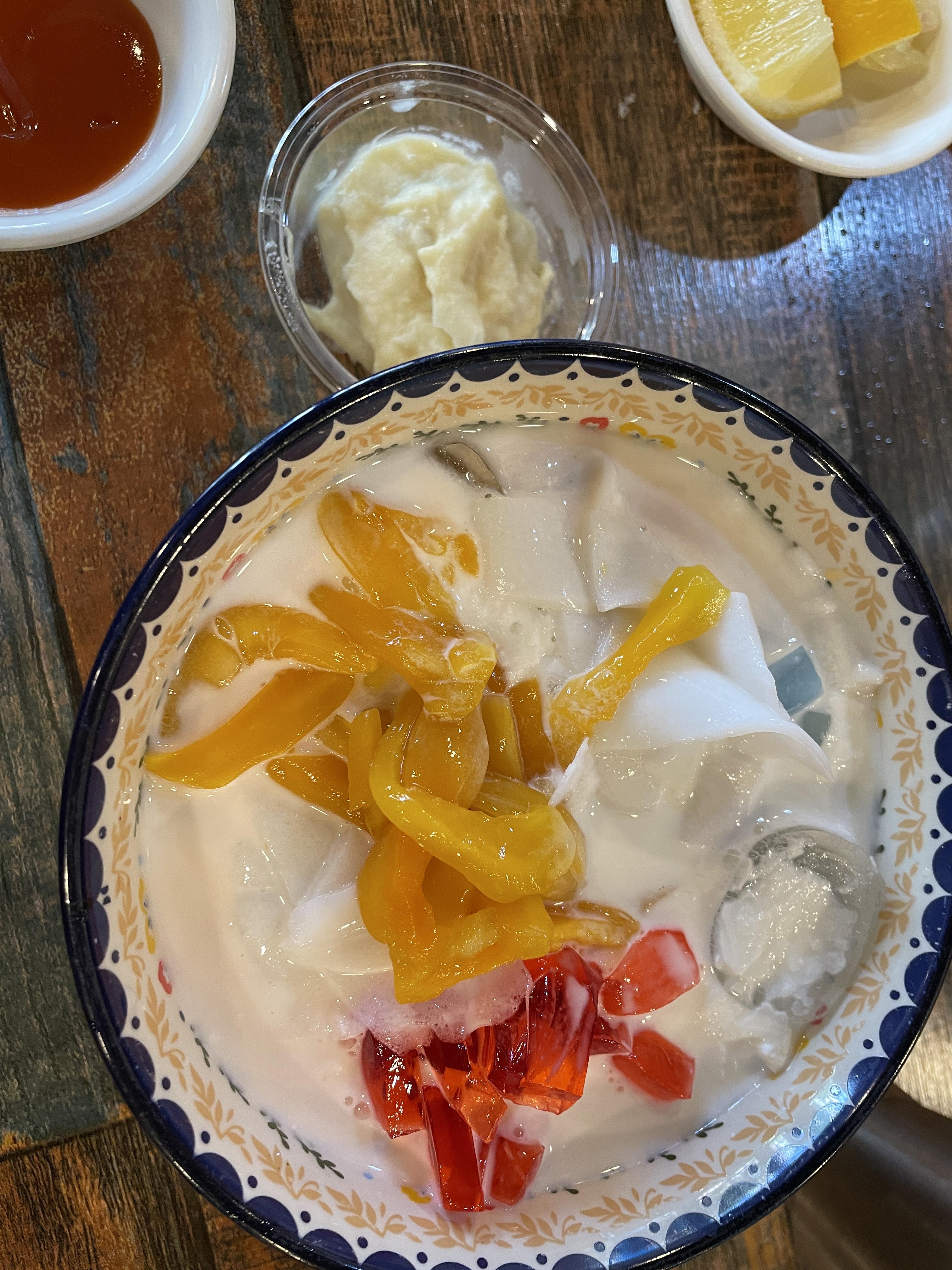 두리안을 망고젤리와 코코넛살과 함께 먹으니 두리안의 강한 맛이 중화가 되서 딱 맛있었어요!