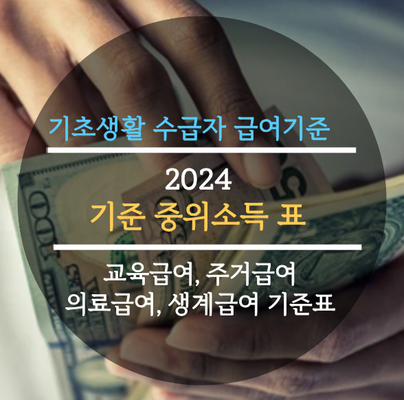 2024 기준 중위소득 표, 기초생활 수급자 급여기준, 교육급여, 주거급여, 의료급여, 생계급여 기준표