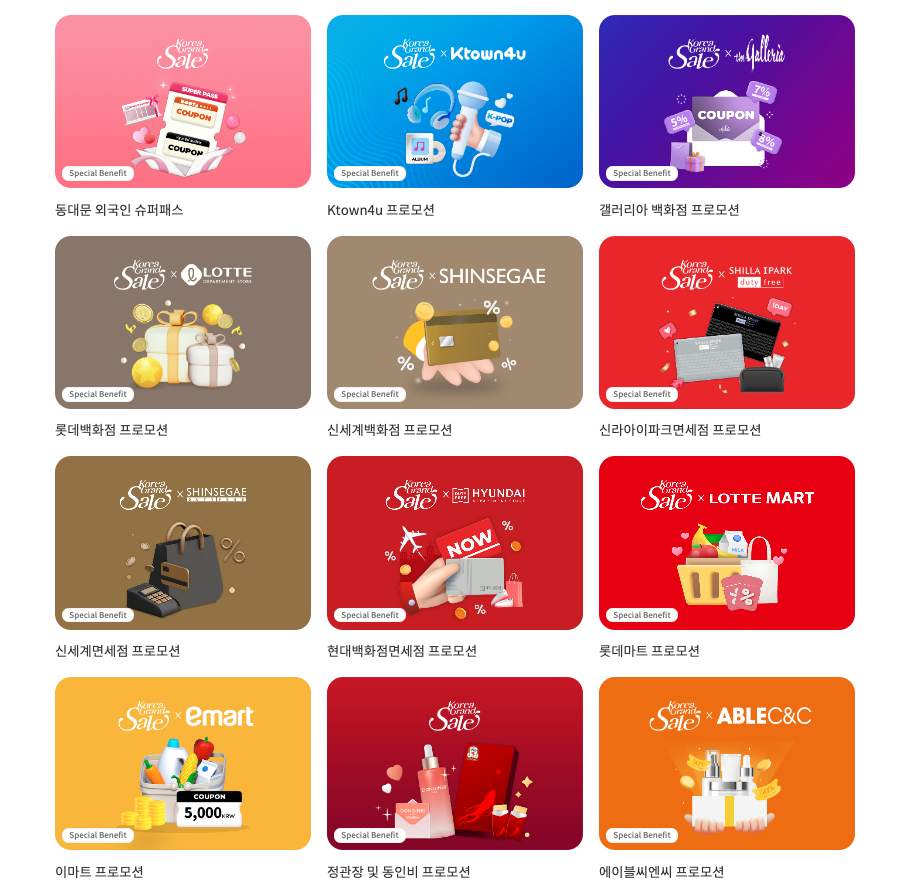 면세점(롯데 ·신라·신라아이I파크·신세계· 현대), 백화점(갤러리아·롯데 신세계), 대형마트(롯데마트·이마트), 아웃렛(두타몰, 현대시티아울렛 동대문점)에서 전국 주요 지점 최대 60% 할인해줍니다. 또한 최대 70만 원 상당의 상품권과 쇼핑지원금을 제공합니다.